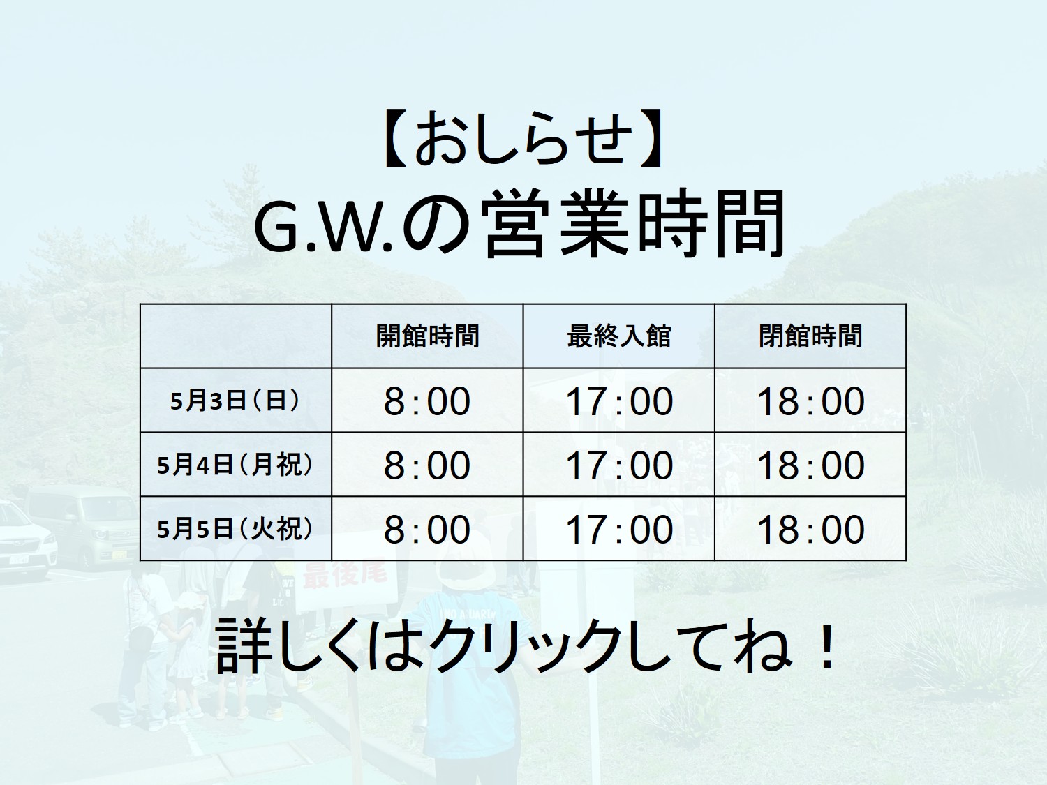 本日の営業時間 9:00 〜 17:00 ※最終入館は16時