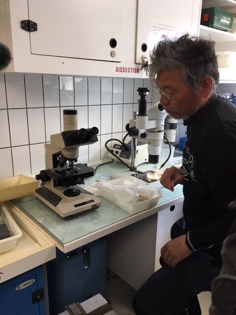 The director of Kamo Aquarium is checking for fertilized eggs under a microscope.