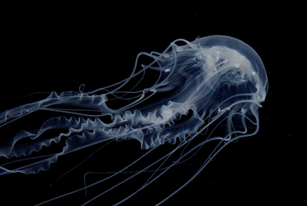 白く透明感があり、とても綺麗だが毒は強く、当館ではミズクラゲを給餌している。