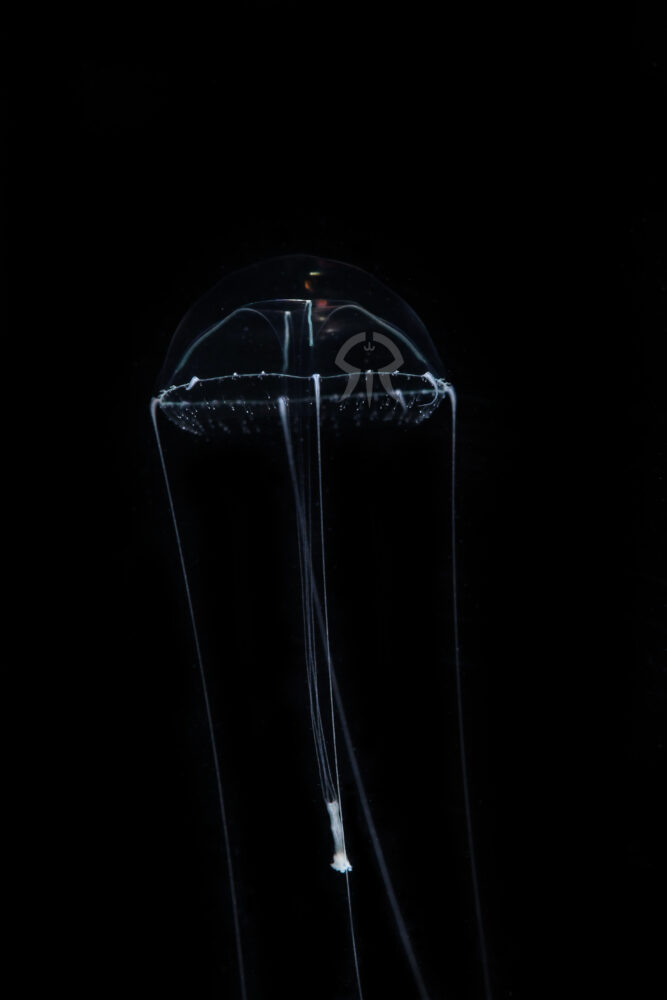 傘縁には8本の長い触手と80本程度の短い糸状体を有する。