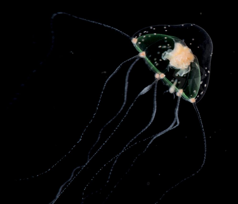 よく見ると、中央の口付近に小さなクラゲが付いていることもある。