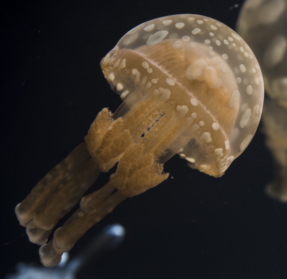 Like other jellyfish, this species eats captured prey, but it can also produce nutrients through photosynthesis performed by symbiotic algae within its body.